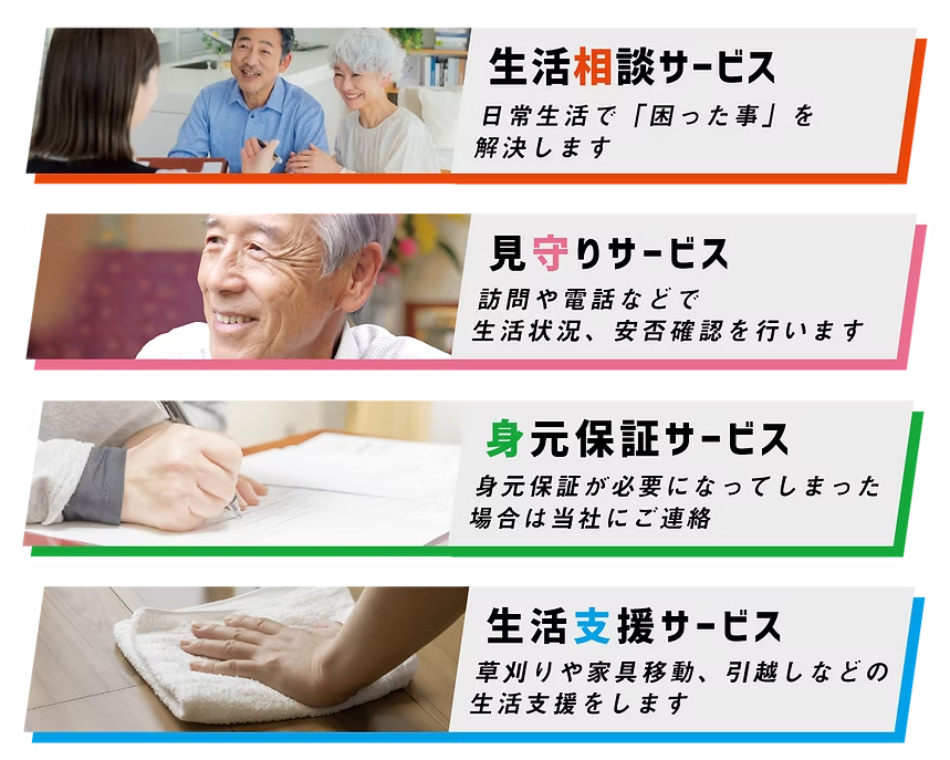 - 訪問介護、買い物支援、健康チェックなど、生活全般にわたるサポートを行います。